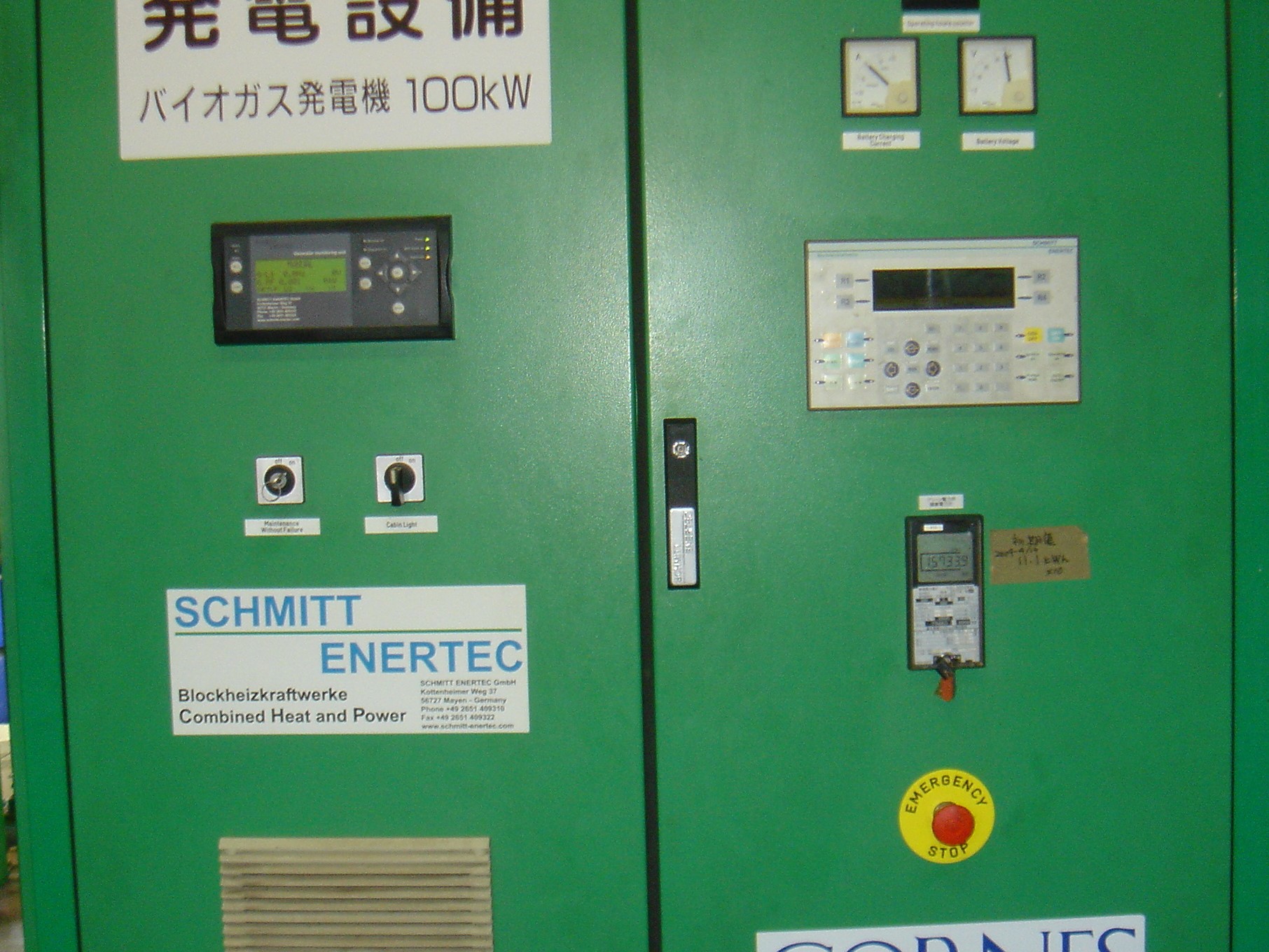 町の乳牛2万頭弱、その糞尿を各農家が複数持っている写真の糞尿コンテナーに入れてプラントに運び込む。このプラントは1日の処理能力は成牛換算で1870頭、これを発酵槽で発酵させ、メタン発酵後の消化液は良質な有機質肥料として写真の貯留槽(3基保有)に貯め、スプレッダーで畑に散布。メタンガスは直接燃焼のガス発電機(写真以外に200キロワットがありコージェネ発電機2機で電気と温水を回収)で、所内の電気を賄ってのち(30億円の施設投資の半分は農水省補助金なので電力会社への売電は制限されているようだ)に北海道電力に売電。しかし今までは単価7円が40円に買い取り制であがり、これで収支がランニングコストから事業費の回収に充てられるようになったとのこと。これだけの規模(町も加わった利用組合方式)だが施設費はやはり大きいのだと認識。規模が小さくても可能かどうか、研究が必要。
