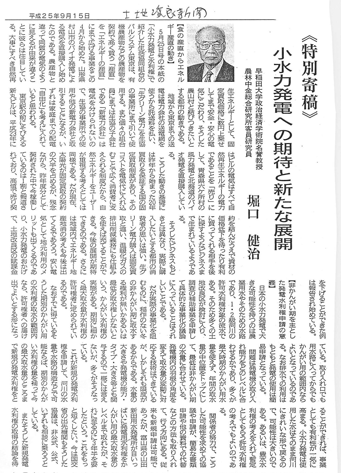 小水力発電と水利権、そして都会の消費者との関係を議論した土地改良新聞の記事を載せます。